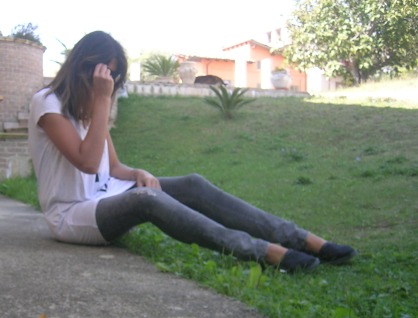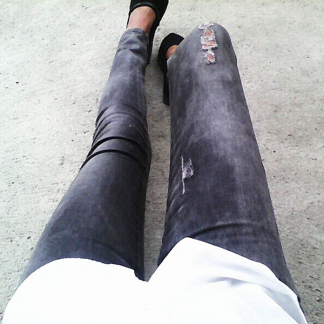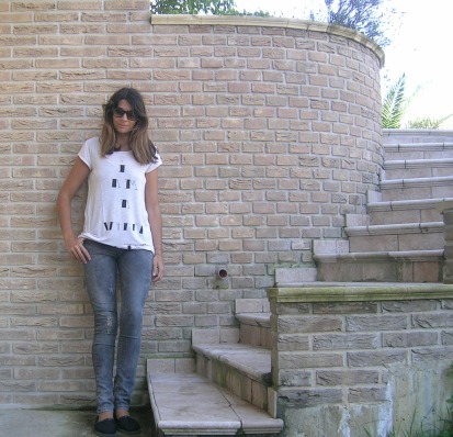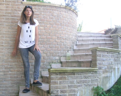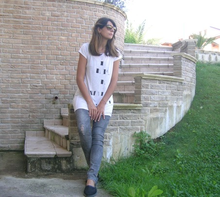 Un outfit semplice, senza troppo pensarci, t-shirt oversize bianca con scritte che spiegano appunto che è solo una white t-shirt, skinny jeans grigi, i miei preferiti, strappati ma senza esagerazioni...